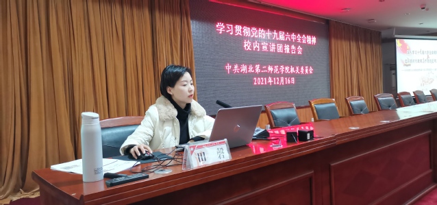 报告会上,党的十九届六中全会精神校内宣讲团成员田磬老师作《深入学习党的十九届六中全会精神 走好新时代教育工作者的赶考之路》专题宣讲。田磬老师从深刻把握党的十九届六中全会的核心要义、结合三个“历史决议”解读党的十九届六中全会《决议》新飞跃、走好新时代教育工作者的赶考之路三个方面解读了全会精神。